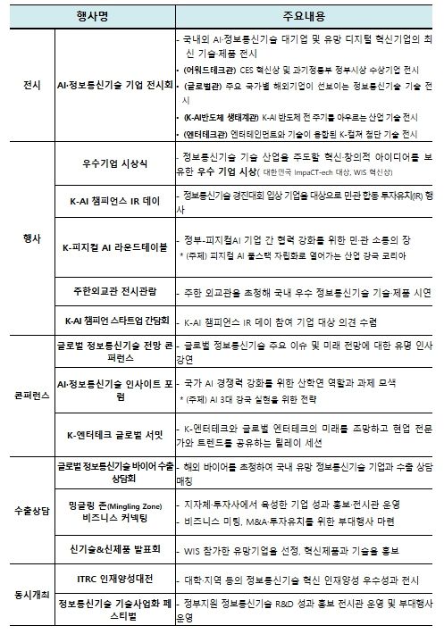 또한, 올해 처음으로 다양한 전문 프로그램도 운영된다. ‘인공지능·정보통신기술 통찰력 토론회(인사이트 포럼)’에서는 인공지능 3대 강국 도약을 위한 정책·기술 전략을 산·학·연 전문가들과 함께 논의하고, ‘한국형 물리적 인공지능 원탁회의(K-피지컬 AI 라운드테이블)’에서는 정부와 기업이 참여하여 산업 현장 중심의 물리적 인공지능(피지컬 AI) 기술 발전 방향과 협력 방안을 모색한다. 아울러, ‘한국형 융합 콘텐츠 기술 세계 정상회의(K-엔터테크 글로벌 서밋)’에서는 K-콘텐츠와 인공지능 기술의 융합 사례를 기반으로 세계 시장 진출 전략과 사업 모델을 공유할 예정이다.