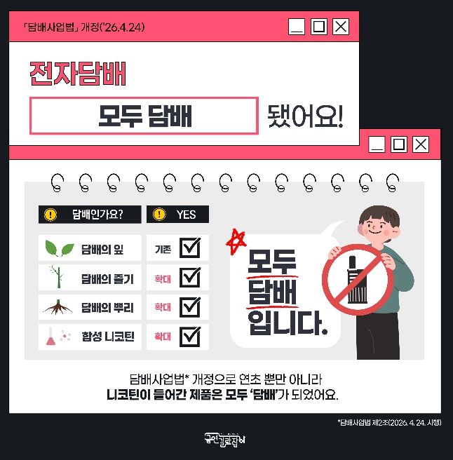 이에 따라 개정법 시행일인 24일부터는 금연구역에서 궐련형‧액상형 전자담배를 포함한 모든 담배를 피울 수 없으며, 위반 시에는 10만 원 이하의 과태료가 부과된다.