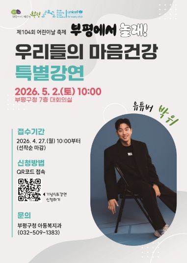 한편, 구는 보다 많은 어린이들이 즐거운 시간을 보낼 수 있도록 어린이주간(5.1.~5.7.) 동안 부평구문화재단, 부평역사박물관 등 지역 내 기관에서 진행되는 어린이 축제와 도서관·체육시설 등 관련 시설 정보를 구청 누리집과 SNS 등을 통해 제공할 예정이다.