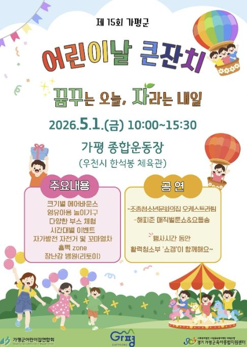인사이드피플 강애자 기자 | 가평군은 오는 5월 1일 오전 10시 가평종합운동장에서 ‘제15회 가평군 어린이날 기념행사’를 개최한다. 가평군어린이집연합회와 가평군육아종합지원센터가 공동 주관하는 이번 축제는 기념행사와 공연, 놀이, 체험 부스 등 다채로운 프로그램으로 꾸며진다.