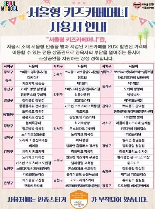 민간 키즈카페 이용 부담을 덜어주기 위한 ‘서울형 키즈카페머니’도 발행된다. 서울시는 4월 24일 오전 10시, 올해 2차분 15억 원을 특별 발행한다. ‘서울형 키즈카페머니’는 캘리클럽, 뽀로로파크 등 서울시내 62개 민간 인증 키즈카페에서 20% 할인된 금액으로 사용할 수 있으며, ‘서울페이+’ 앱을 통해 1인당 월 20만 원까지 구매 가능하다.