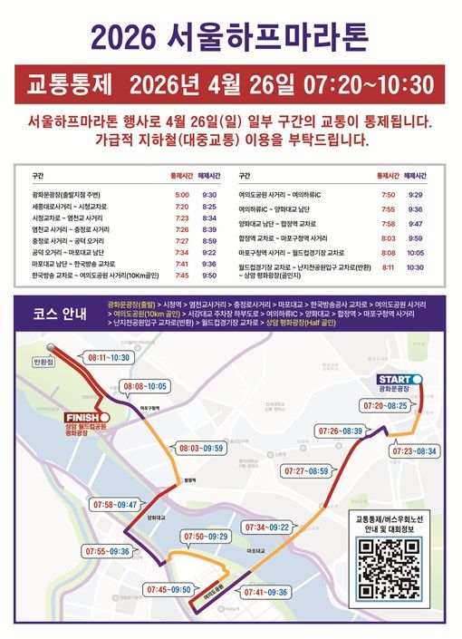 김명주 서울시 관광체육국장은 “올해로 10회를 맞는 서울하프마라톤은 시민과 함께하는 대표 도심 마라톤 행사로 봄기운이 완연한 도심 속에서 활력을 더하는 축제”라며 “대회 당일 일부 도로의 불가피한 교통 통제가 이루어지는 만큼 시민 여러분의 너그러운 양해와 적극적인 협조를 부탁드린다”라고 말했다.