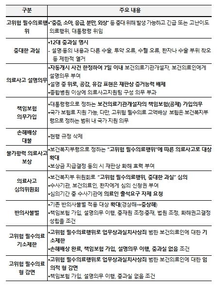 보건복지부는 하위법령 개정을 위한 협의체를 구성하여 의료진, 환자·소비자단체, 전문가 등과 충분한 협의를 통해 ‘고위험 필수의료행위 범위, 책임보험 보장기준, 의료사고심의위원회 운영방안’ 등을 구체화할 계획이다.