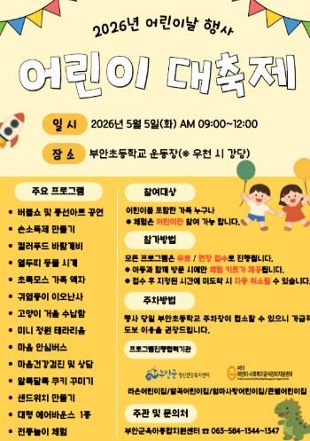 인사이드피플 강애자 기자 | 부안군육아종합지원센터는 오는 5월 5일 오전 9시부터 12시까지 부안초등학교 운동장에서 ‘어린이 대축제’를 개최한다고 밝혔다.