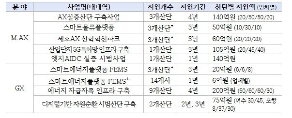 산업부는 2019년부터 현재까지 24개 산업단지를 스마트그린산단으로 지정했으며, 스마트그린산단을 대상으로 AX 실증산단 구축, 에너지 자급자족 인프라 구축 등 산업단지의 M.AX와 GX를 위한 스마트그린산단 지원사업을 추진 중이다.