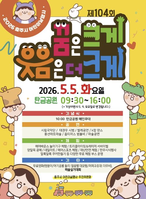 인사이드피플 강애자 기자 | 충주시는 오는 5월 5일 오전 9시 30분부터 탄금공원에서 ‘제104회 어린이날’을 기념하는 ‘2026 어린이날 행사’를 개최한다고 밝혔다.