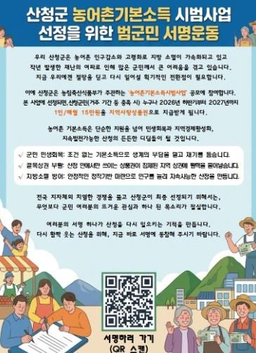 인사이드피플 노재현 기자 | 산청군은 ‘농어촌기본소득 시범사업 선정 기원 범군민 서명운동’에 돌입했다고 29일 밝혔다.