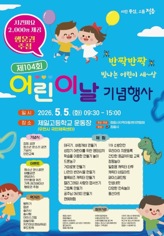인사이드피플 노재현 기자 | 정읍시는 다가오는 제104회 어린이날을 맞아 오는 5월 5일 정읍제일고등학교 운동장(우천 시 국민체육센터)에서 어린이날 기념행사를 개최한다.