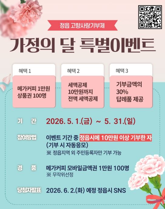 시는 이벤트 기간 기부자 가운데 100명을 무작위로 추첨해 1만원 상당의 메가커피 상품권을 증정할 예정이다. 당첨자는 6월 2일 정읍시 공식 누리소통망(SNS)을 통해 발표된다.