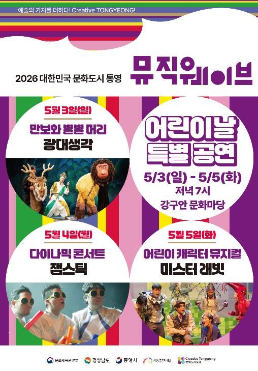인사이드피플 강애자 기자 | (재)통영문화재단은 어린이날을 맞아 오는 5월 3일부터 5일까지 3일간 오후 7시 강구안 문화마당에서 2026 뮤직웨이브 어린이날 특별공연‘만보와 별별머리’,‘다이나믹 콘서트’,‘미스터 래빗’을 진행한다.