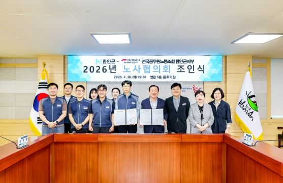 인사이드피플 노재현 기자 | 함안군은 지난 28일 군청 3층 중회의실에서 전국공무원노동조합 함안군지부(지부장 조주환)와 공무원 권익 향상과 복지 증진을 위한 노사협의회 합의서에 최종 서명했다고 밝혔다.