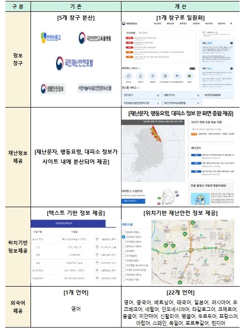 기상특보나 사고정보 등 실시간 재난상황 정보를 제공하는 재난 유형은 기존 9종에서 26종으로 확대된다. 특히 재난별 상황정보, 재난문자, 대피소 위치, 국민행동요령을 통합 안내함으로써 위기 상황에서 국민이 신속하게 대처할 수 있도록 돕는다.