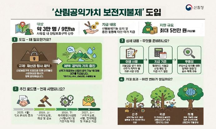 ‘산림보전지불제’는 산주가 시‧도지사와 산림보호 협약을 체결 후 산림보호구역의 공익기능 유지‧증진을 위한 활동에 참여하면 그 비용을 ‘산림공익가치 보전지불금’으로 지급 받을 수 있는 지원체계로, 2027년부터 관련 예산을 확보해 시범사업*을 추진하고 점차 확대할 계획이다.