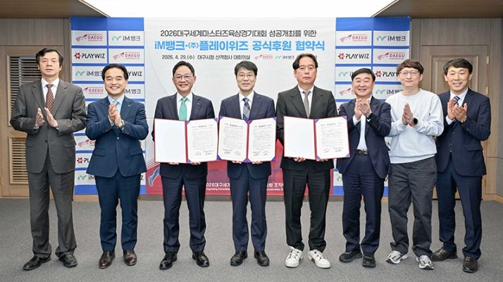 이날 협약식에는 김정기 대구광역시장 권한대행 행정부시장 겸 조직위원장, 강정훈 iM뱅크 은행장, 김동조 ㈜플레이위즈 대표이사, 진기훈 조직위 사무총장 등이 참석해 대회의 성공 개최를 위한 협력과 지원을 약속했다.