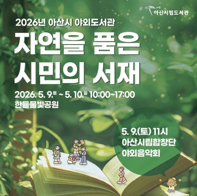 인사이드피플 노재현 기자 | 아산시립도서관은 오는 5월 9일부터 10일까지 한들물빛공원 일원에서 야외도서관 '자연을 담은 시민의 서재'를 운영한다.