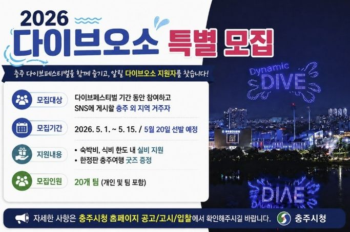 인사이드피플 노재현 기자 | 충주시가 ‘2026 충주 다이브 페스티벌 with MyK FESTA’을 맞아 지역 관광의 매력을 널리 알릴 특별 홍보단 ‘다이브 오소(O-SO) 충주’ 참여자를 모집한다고 밝혔다.