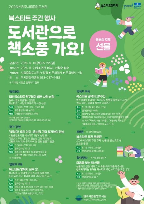 인사이드피플 강애자 기자 | 원주시립중앙도서관은 독서문화 확산을 위해 다음 달 16일부터 22일까지 2026 북스타트 주간 행사 ‘도서관으로 책소풍 가요!’를 운영한다.