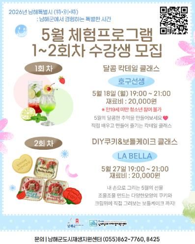 인사이드피플 노재현 기자 | 남해군 도시재생지원센터가 신록이 짙어가는 5월을 맞아, 군민들에게 일상 속 특별한 미식 경험과 힐링을 선사할 ‘5월 쿠킹클래스’를 마련하고 수강생 모집에 나선다.
