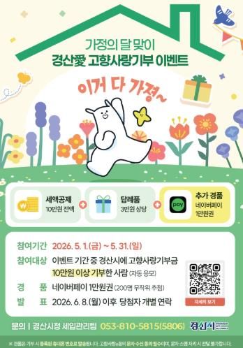 인사이드피플 노재현 기자 | 경산시는 5월 가정의 달을 맞아 ‘경산愛 고향사랑기부 이벤트’를 5월 1일부터 31일까지 한 달간 실시한다.