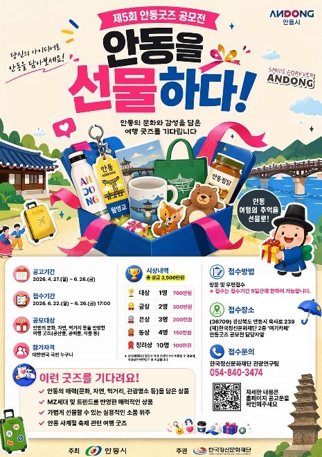 인사이드피플 노재현 기자 | 안동시와 (재)한국정신문화재단은 관광거점도시 안동의 지역 브랜드 가치를 높이고 경쟁력 있는 관광 상품을 발굴하기 위해 『제5회 안동을 선물하다! 안동굿즈 공모전』을 개최한다고 밝혔다.