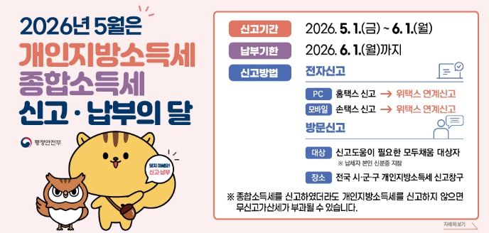 종합소득세는 2025년에 발생한 사업소득, 근로소득, 이자·배당소득, 연금소득, 기타소득 등을 합산해 신고하는 세금이다. 개인지방소득세는 종합소득세의 10%에 해당하는 지방세로, 종합소득세 신고와 함께 5월 1일부터 6월 1일까지 신고·납부해야 한다.