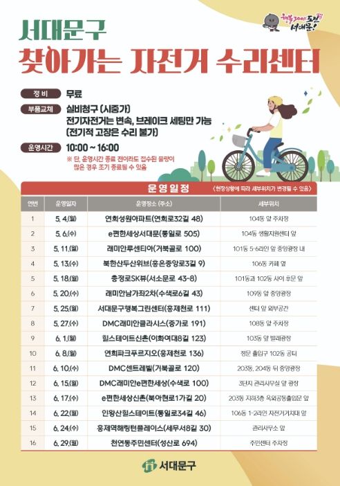 인사이드피플 노재현 기자 | 서대문구가 주민들의 자전거 이용 활성화와 안전한 운행을 위해 5∼6월과 9∼11월 ‘찾아가는 자전거 수리센터’를 총 32회 운영한다.