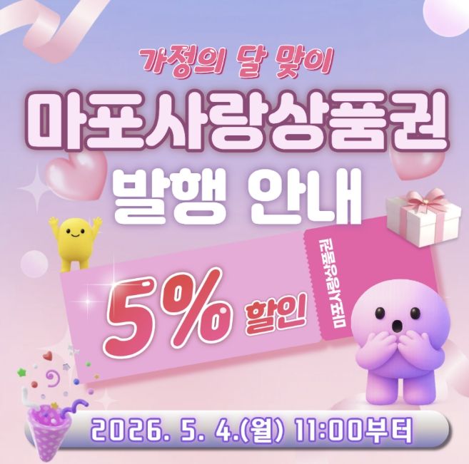 마포구 관계자는 “가정의 달을 맞아 가족을 위한 지출이 많은 시기인 만큼, 이번 상품권이 장보기나 외식 등 일상 속 소비에 도움이 됐으면 한다”며, “모두가 따뜻하고 행복한 가정의 달을 보내시길 바란다”고 말했다.