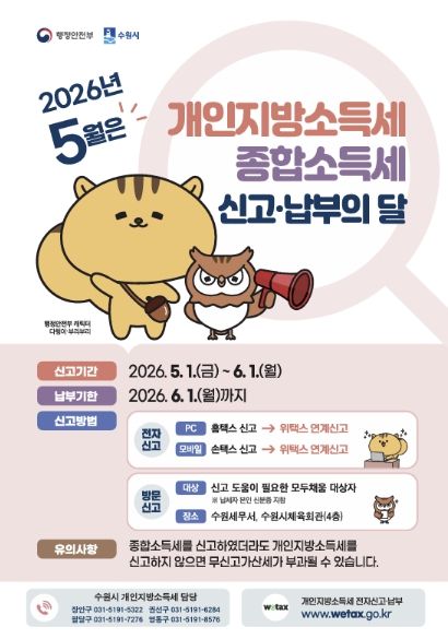 인사이드피플 노재현 기자 | 수원시 장안구는 2026년 개인지방소득세 신고·납부의 달을 맞아, 지난해 12월 31일 기준으로 장안구 내 주소지를 둔 개인은 5월 1일부터 6월 1일까지 개인지방소득세를 신고·납부해야 한다고 밝혔다.