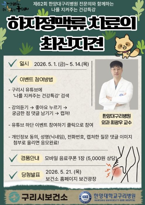 인사이드피플 노재현 기자 | 구리시는 5월 1일 시민의 혈관 건강 증진과 최신 의료정보 제공을 위해 시 공식 유튜브 채널 ‘구리비전’을 통해 ‘하지정맥류 치료의 최신지견’을 주제로 한 건강특강을 송출한다고 밝혔다.