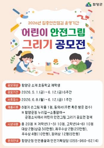 인사이드피플 노재현 기자 | 함양군은 ‘2026년 집중안전점검 기간’을 맞아 지역 내 안전문화 확산과 어린이들의 안전의식 향상을 위해 ‘2026년 어린이 안전그림 그리기 공모전’을 진행한다.