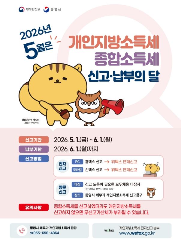 인사이드피플 심정보 기자 | 통영시는 5월 개인지방소득세 및 종합소득세 신고·납부의 달을 맞아 2025년도에 종합소득이 있는 개인은 오는 6월 1일(월)까지 개인지방소득세와 종합소득세를 신고·납부해야 한다고 밝혔다.