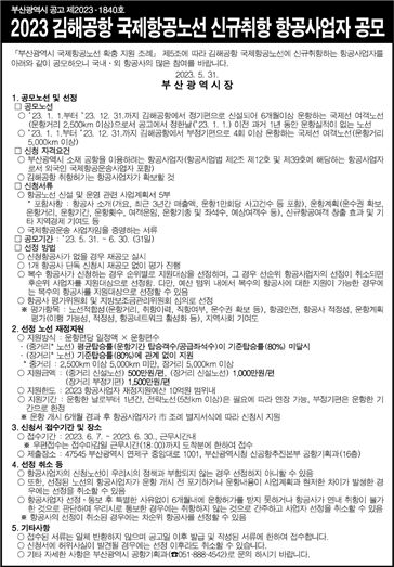 인사이드피플 박미영 기자 | 부산시는 오늘(31일)부터 다음 달 30일까지 '2023 김해공항 국제항공노선 신규취항 항공사업자 공모'를 진행한다고 밝혔다.
