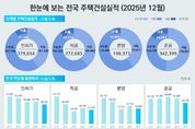 인사이드피플 노재현 기자 | 국토교통부는 2025년 12월 기준 주택 통계를 공표했다. 2025년 12월 주택 인허가, 착공, 분양, 준공 실적은 12월 수도권 인허가는 82,077호로 전년동월(119,541호) 대비 31.3% 감소, 12월 누적 실적은 222,704호로 전년동기(234,083호) 대비 4.9% 감소했다. 서울 지역 12월 인허가는 2,576호로 전년동월(18,441호) 대비 86.0% 감소, 12월 누적 실적은 41,566호로 전년동기(51,452호) 대비 19.2% 감소했다. 비수도권 12월 인허가는 20,712호로 전년동월(39,904호) 대비 48.1% 감소, 12월 누적 실적은 157,130호로 전년동기(201,151호) 대비 21.9% 감소했다. 12월 수도권 착공은 40,344호로 전년동월(29,965호) 대비 34.6% 증가, 12월 누적 실적은 166,823호로 전년동기(163,255호) 대비 2.2% 증가했다. 서울 지역 12월 착공은 10,050호로 전년동월(3,620호) 대비 177.6% 증가, 12월 누적 실적은 32,119호로 전년동기(26,0