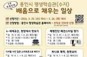 인사이드피플 노재현 기자 | 용인특례시는 25일부터 26일까지 수지구에 있는 용인시 평생학습관에서 특별강좌 수강생을 모집한다고 17일 밝혔다. 이번 특별강좌는 4주 과정으로, 시민의 수요를 반영해 실생활에 도움이 되는 다양한 강좌로 구성됐다. 총 8개 강좌를 운영하며 112명의 수강생을 모집한다. 주요 프로그램은 ▲인문교양 분야(K-세계유산, 현장에서 멋보기) ▲뷰티 분야(체형 진단 패션스타일 찾기) ▲정보화 분야(디지털 사진 입문: 스마트폰으로 배우기) ▲조리 분야(우리 집 김치 만들기) ▲문화예술 분야(쉽고 편한 보컬 발성법 야간) 등이다. 교육은 3월 30일부터 4월 24일까지 진행되며 만 19세 이상 용인시민이라면 누구나 신청할 수 있다. 용인에 주소를 둔 재외국민, 결혼이민자, 용인 소재 기업에 재직 중인 직장인도 참여 가능하다. 접수는 용인시 평생학습관 누리집을 통해 선착순으로 진행된다. 수강료는 강좌별 수업 시간에 따라 1만 원에서 1만 5000원이며, 재료비는 별도로 개인이 부담한다. 시 관계자는 “시민이 배움의 가치를 느낄 수 있도록 실생활에 도