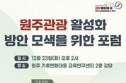 인사이드피플 노재현 기자 | 원주시는 오는 23일 오후 2시, 기후변화대응교육연구센터 2층 대강당에서 ‘원주관광 활성화 방안 모색을 위한 포럼’을 개최한다. 이번 포럼은 원주시와 강원일보가 공동으로 주최하고, 한국관광공사와 (재)강원관광재단이 후원한다. 원주 관광산업의 현주소를 진단하고 타 지역의 우수사례를 공유해, 원주관광의 발전 방향을 제시하는 자리이자, 원주 관광산업 활성화를 위한 다양한 방안과 대안을 모색하는 장이 될 전망이다. 포럼은 상상콘텐츠연구소 이종원 소장의 ‘여행작가가 바라본 강원특별자치도 원주시’ 기조강연으로 시작된다. 이어 한국관광공사 이재훈 국민관광전략팀장이 로컬관광 활성화 전략 우수사례를 공유하고, 한라대학교 배준호 교수가 원주 지역 웰니스 관광 활성화 전략을 발표했다. 또한 김혁성 원주시의원이 관광콘텐츠 개발 연구회 성과를 소개한다. 마지막으로 강원일보 권혁순 논설주간이 좌장을 맡아 상지대학교 장병주 경상대학장, 강원관광재단 원문규 관광마케팅실장, 정영직 원주시관광협의회장이 토론을 진행하며 질의응답 시간을 갖는다. 원강수 원주시장은 “이번 포럼에서 제시되는 창의적이고 심도