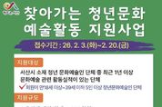 인사이드피플 노재현 기자 | 충남 서산시는 청년 문화예술 활성화를 위해 오는 2월 20일까지 ‘2026년 찾아가는 청년문화 예술활동 지원사업’ 참여단체 6팀을 모집한다고 밝혔다. 이번 지원사업은 지역 청년 문화예술인의 문화예술 참여기회를 확대하고 역량을 강화하기 위해 추진된다. 지원 대상은 서산시에서 활동하는 청년 문화예술인 단체이며 18세 이상 39세 이하인 회원이 5인 이상인 단체다. 사업 추진을 희망하는 단체는 최근 1년 이상 문화예술 관련 활동 실적이 있어야 하며, 동일 사업으로 국가나 다른 지자체·공공단체 등에서 지원금을 받는 경우 선정 대상에서 제외된다. 지원 분야는 연극·음악·무용·전통예술 등 공연 부문과 지역 주민을 대상으로 한 문화예술 교육프로그램 기획 부문이다. 신청은 서산시청 문화예술과에 방문 또는 우편 접수로 가능하며, 자세한 사항은 서산시 누리집에 게시된 공고문을 통해 확인할 수 있다. 시는 부서심사와 지방보조금관리위원회 심의를 거쳐 참여단체를 선정한 뒤 3월 중 개별 통보할 예정이며, 선정 단체에는 최대 400만 원을 지원할 방침이다.