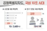 인사이드피플 심정보 기자 | 강원특별자치도는 국비 확보 10조 시대에 진입한 가운데, 인구 1인당 국비 확보액이 약 680만 원으로 전국 1위에 해당한다고 밝혔다. 2026년도 강원특별자치도 국비 확보액은 총 10조 2,600억 원으로 경기, 경북, 충남, 경남에 이어 전국 시도 중 5위에 해당한다. - 이는 도보다 인구가 2배 이상 많은 인천(6조 4,000억 원)과 부산(10조 2,000억 원)보다 많은 수치이다. 특히 국비 총액을 인구수로 환산한 인구 1인당 국비 확보액은 약 680만 원으로 전국 평균 413만 원을 크게 웃도는 수치다. 도는 이번 국비 확보 성과가 정부 차원에서 도가 추진 중인 주요 사업의 필요성과 중요성에 대한 공감한 결과로 보고 있다. 도는 앞으로 국비가 단순한 규모에 그치지 않도록 사업 추진의 완성도와 체감 성과를 높이는 데 행정력을 집중할 계획이다. 김진태 지사는 “국비 10조 원이 체감되기 어려울 수 있지만 총 규모로는 전국 기준 5위, 도민 1인당으로 환산하면 약 680만 원으로 전국 1위에 해당한다”며, “확보된 국비가 현장에서 차질없이