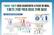 인사이드피플 장은미 기자 | 문화체육관광부는 올해 1분기(1~3월) 한국을 방문한 외국인 관광객이 약 476만 명을 기록하며, 3월 중동사태 발생에도 불구하고 1분기 기준 역대 최대 규모를 달성했다고 밝혔다. 이는 2025년 같은 기간 대비 23% 증가한 수치이며, 특히 3월에는 외래객 약 206만 명이 방한해 월별 기준으로도 최대 실적을 경신했다. ‘케이-컬처’의 세계적 인기와 더불어 민관의 적극적인 외래관광객 유치 노력이 결실을 본 것으로 분석된다. 시장별로 보면, 중국 관광객이 145만 명(+29%)을 돌파하며 가장 큰 비중을 차지했고, 일본 관광객도 94만 명(+20.2%)이 한국을 찾으며 성장세를 이어갔다. 대만 관광객은 54만 명(+37.7%)까지 증가하여 주요 시장 중 증가세가 가장 두드러졌다. 그 외 미국, 유럽 등 원거리 시장 외래객도 69만 명(+17.1%)으로 증가하며 방한 시장 다변화를 이끌었다. 올해 1분기에는 크루즈 관광 시장의 성장도 돋보였다. 제주·부산·인천 등 주요 기항지로 입항한 크루즈선은 총 338척(항차 기준)으로 전년 같은 기간 대비 52.9% 증가했다. 이는 정부가 추진해 온 기항지