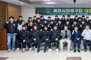 인사이드피플 조은설 기자 | 제천시민축구단 선수단과 구단주의 공식 대면식이 지난 11일 제천시청에서 열렸다. 오는 24일 창단식을 앞두고 열린 이번 대면식에는, 구단주인 김창규 제천시장과 김용기 단장, 선수단 등 관계자들이 참석했다. 선수와 코치진 구성을 마친 제천시민축구단은 구단주와 공식적으로 첫인사를 나누고, 팀의 운영 방향과 시즌 목표를 공유했다. 대면식은 선수단과 코치진 소개, 이번 시즌 운영 계획과 목표 발표, 질의응답 순으로 진행됐다. 김창규 제천시장은 인사말을 통해 선수단을 격려하며, “제천시를 대표하는 시민구단으로서 책임감을 가지고 모든 경기에 최선을 다해달라”고 당부했다. 김용기 단장은 구단 운영 방침과 비전을 소개하며, “제천시와의 협력을 바탕으로 투명하고 신뢰받는 구단을 만들어가겠다”라고 의지를 밝혔다. 한상구 감독은 “2026시즌 목표로 K4리그 상위권 진입과 리그컵 및 코리아컵 3라운드 이상 진출, 충청북도 대표 선발전 승리를 통한 전국체전 우승에 도전하겠다”라며 각오를 밝혔다. 공격수 손주원 선수는 개인 목표를 밝히며, “매 경기 공격 포인트를 기록해 팀에 기여
