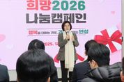 인사이드피플 강애자 기자 | 안성시는 12월 4일 경기 사회복지공동모금회와 함께 ‘희망 2026 나눔캠페인’ 행사를 열고, 연말연시 따뜻한 나눔 분위기 확산에 나섰다. 이날 행사에는 김보라 안성시장을 비롯하여 경기 사회복지공동모금회 김효진 사무처장 및 관계자, 그리고 지역 내 주요 기부 참여 기업인 ㈜그랜드썬기술단에스피, 한솔아이원스(주), ㈜삼양컴텍, 한일크린에너지(주), 골프클럽큐레저산업(주) 등 기업인들이 함께해 자리를 빛냈다. ‘희망 2026 나눔캠페인’은 2025년 12월 1일부터 2026년 1월 31일까지 두 달간 진행되며, 안성시의 모금 목표액은 5억 원이다. 시민과 지역 기업이 정성으로 모은 성금과 물품은 관내 어려운 이웃에게 전달될 예정이다. 행사 주요 내용으로는 캠페인 소개를 시작으로 ‘사랑의 온도탑 제막식’과 ‘명사 열매달기’ 행사가 진행됐으며, 이어 기부금(품) 전달식이 열려 본격적인 나눔캠페인의 출발을 알렸다. 김보라 안성시장은 “이번 ‘희망 2026 나눔캠페인’을 통해 따뜻한 나눔의 가치가 지역사회 전반에 퍼지길 바란다”며 “시민 모두가 동참해 어려운 이웃과 온정을 나누는
