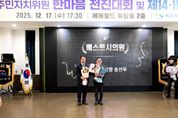 인사이드피플 김재윤 기자 | 목포시의회 송선우(산정·대성·죽교·북항동) 관광경제위원장이 17일 에메랄드 웨딩홀 2층에서 열린 제8회 목포시 주민자치위원 한마음 전진대회에서 ‘목포시 주민자치위원회 베스트 시의원상’을 수상했다. 이 상은 목포시 주민자치위원장협의회가 수여한 것으로, 지역 주민과의 소통을 바탕으로 한 헌신적인 의정활동과 주민자치 발전에 기여한 공로를 인정해 마련됐다. 해당 상은 이번 회차에 처음 제정돼 송선우 위원장이 초대 수상자의 영예를 안았다. 송 위원장은 평소 탁월한 소통 능력을 바탕으로 주민들의 다양한 의견을 의정활동에 적극 반영해 왔으며, 특히 지역 현안 해결 과정에서 보여준 진정성과 열정으로 주민자치의 모범을 제시했다는 공로를 인정 받았다. 또한 주민 복지 향상과 지역 발전을 위한 실질적인 정책 추진에 힘써 왔다는 점에서 높은 평가를 받았다. 송선우 위원장은 수상 소감을 통해 “이 상은 개인이 아닌, 현장에서 함께 고민하고 노력해 온 주민자치위원 여러분과 시민들께서 주신 상이라고 생각한다”며 “앞으로도 주민의 목소리에 더욱 귀 기울이며, 주민자치가 지역 발전의 중심