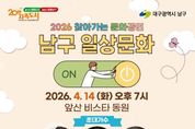 인사이드피플 강애자 기자 | 대구 남구는 지역 주민들에게 일상 속 문화 향유 기회를 확대하고, 지역 예술가들의 공연 활동을 지원하기 위해 ‘2026 찾아가는 문화공연’ 을 개최한다. 관내 신규 입주 공동주택을 대상으로 공연을 희망하는 아파트 단지를 선정하였으며, 오는 4월 14일(화) 앞산비스타동원 아파트에서 첫 공연을 진행할 예정이다. 저녁 7시에 열리는 ‘앞산비스타동원 음악회’에서는 인기 개그맨 김재롱이 사회를 맡고, 지역 가수 이새벽과 미스트롯 4 출연자 장혜리 가수가 공연을 펼친다. 또한, 아파트 입주 후 처음으로 열리는 주민 참여 행사인만큼 입주자 대표회에서도 다양한 경품과 선물을 준비하여 주민 화합의 장을 만들 예정이다. 조재구 남구청장은 “대규모 축제나 행사도 중요하지만, 주민들이 사는 가까운 동네에서 편하게 문화예술을 접할 수 있도록 찾아가는 문화행정을 적극 추진하겠다.”라며, “아파트로 찾아가는 음악회를 통해 주민들이 일상에서 소소한 행복을 느끼며 힐링할 수 있기를 바란다.”라고 전했다. ‘찾아가는 문화공연’에 대한 문의는 남구 문화관광과 문화예술팀으로 연락하면 안내받을 수 있다.
