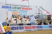 인사이드피플 노재현 기자 | 전남 나주시가 본격적인 영농철을 앞두고 농업인의 화합과 결속을 다지며 풍년 농사를 기원하는 영농발대식을 개최했다. 나주시는 지난 25일 영산강둔치체육공원에서 ‘2026년 농업인 영농발대식’을 열고 한 해 농사의 시작을 알렸다고 26일 밝혔다. 이번 행사는 나주농민회(회장 박용래)와 나주시여성농민회(회장 송숙희)가 공동 주관했으며 지역 농업인과 시민 등 1500여 명이 참석해 새로운 농사의 출발을 함께했다. 영농발대식은 매년 영농철을 앞두고 농업인의 무사 안녕과 풍년을 기원하고 영농 의지를 다지는 나주시 대표 농업 행사로 자리잡고 있다. 특히 기후변화와 농자재 가격 상승, 농촌 고령화와 인력 부족 등 어려운 여건 속에서 농업인의 사기를 높이고 지속 가능한 농업 발전 의지를 다지는 의미를 더했다. 이날 행사는 풍물패 길놀이 공연을 시작으로 나주시립국악단 축하공연과 고천제가 이어지며 한 해 풍년과 농업인의 안녕을 기원했다. 기념식에서는 농민회장과 여성농민회장의 대회사와 함께 전농 광주전남연맹 의장의 격려사, 농업 발전과 농민 권익 향상을 위한 결의문이
