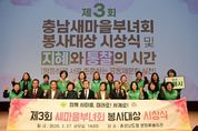 인사이드피플 노재현 기자 | 김태흠 충남도지사는 27일 도청 문예회관에서 열린 제3회 충남새마을부녀회 봉사대상 시상식에 참석, 지역사회를 위해 헌신해온 부녀회장들을 격려했다. 충남새마을회와 충남새마을부녀회가 주최·주관한 이번 행사에는 김 지사와 정광섭 도의회 부의장, 강승규 국회의원, 김정임 새마을부녀회 중앙연합회장, 박숙희 충남새마을부녀회장, 시군 새마을부녀회장 등 800여 명이 참석했다. 행사는 표창 수여, 우수사례 발표, 약속문 낭독, 기념촬영 등의 순으로 진행했다. 표창 수여에서 대상은 천영옥 논산시 채운면 새마을부녀회장이 받았다. 천 회장은 2015년부터 11년 동안 채운면 새마을부녀회장을 역임하며, 독거노인 480세대에 밑반찬을 제공하고, 부녀회원과 독거노인 간 1대 1 결연을 통해 청소와 빨래 봉사 등을 꾸준히 이어올 수 있도록 이끌어온 공로를 인정받으며 이번 영예를 안았다. 채운면 부녀회는 또 매년 120세대에 김장김치와 연탄을 지원하고, 11년 동안 헌옷을 수거·판매해 수익금 전액을 취약계층에 기부하는 등 공동체 봉사에 헌신해왔다. 우수상은 송미경 홍성