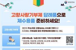 인사이드피플 장은미 기자 | 고향사랑기부제 답례품으로 제수용품 준비하세요! ■ 고향사랑기부제 개인이 주소지 외 고향(원하는 지역)에 기부하고 지자체는 기부금을 모아 주민복리에 활용하는 제도 ■ 기부방법 고향사랑e음 / 농협창구 방문 / 9개 민간플랫폼* *국민은행, 기업은행, 신한은행, 하나은행, 농협은행, 공감만세, 액티부키, 웰로, 체리 ■ 혜택 ① 기부금 10만 원까지 전액 세액공제 *10만 원 초과 20만 원 이하(특별재난지역 포함) 44% 세액공제('26.1.1.~) ② 기부금 30% 상당의 지역특산물 등 답례품 제공 ③ 특별재난지역 기부 20만 원 초과분 33% 세액공제 (재난선포일로부터 3개월 이내 기부 시 적용) 미사용 답례품 포인트가 있다면 포인트를 활용해 알뜰하게 장만해 보세요.