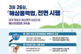 인사이드피플 장은미 기자 | ■ 3월 26일, 「해상풍력법」 전면 시행 국가 주도의 해상풍력 보급으로 에너지 대전환 가속화 ① 정부 주도의 입지발굴로 계획입지 조성 민간사업자 개별 발굴로 해양 공간 난개발 및 환경훼손 → 어업·환경 등 영향이 적고 지속가능한 해상풍력 개발 ② 속도감 있는 사업 추진 28개 법령에 따른 42개 인허가로 사업 장기화 → 인허가 일괄처리 도입으로 사업기간(3~4년) 단축 ③ 지역·주민 상생 절차 마련 이해관계자 참여 창구가 부재하여 갈등 발생 시 해결 방안 없음 → 지자체 주도 이해관계자가 참여하는 민관협의회 운영 ④ 해상풍력 산업생태계 육성 선박, 항만, 공급망 등 해상풍력 산업생태계 육성을 위한 지원근거 없음 → 기술개발, 인력양성, 실증단지 조성 등 산업진흥 기반 마련 ■ 해상풍력법 시행 효과 · 에너지 대전환 - 대규모 친환경 에너지 공급 - 안정적 전력 공급 기반 확보 및 지정학적 리스크 대응 · 지역 상생발전 - 양질의 지역 일자리 창출 - 주민 이익공유로 소득 증대 · 산업 경쟁력 강화 - 터빈, 철강, 케이블 등 복합산