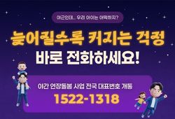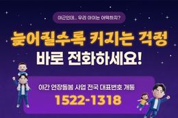 인사이드피플 장은미 기자 | 야근인데… 우리 아이는 어떡하지? 늦어질수록 커지는 걱정 바로 전화하세요! ■ 야간 연장돌봄 사업 전국 대표번호 개통 '1522-1318' · 6~12세 아동 누구나 이용 가능 · 전국 343개 돌봄시설 운영 중 · 평일 18시~22시 또는 24시까지 이용 가능 · 가까운 지역 상담센터 자동 연결 · 2시간 전 신청 가능(긴급 이용 OK) 국번 없이 ☎1522-1318을 누르면 지역 상담센터로 자동 연결되어 가까운 이용 가능 센터를 안내받을 수 있습니다.
