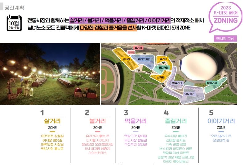 디지털 전통시장관에서는 개성과 특색을 갖춘 시장의 실제 모습을 무인 단말기(키오스크)를 통해 간접 체험과 정보 등을 볼 수 있도록 마련했으며, 전통시장 역사박물관 등 다양한 콘텐츠들도 전시된다. 또한, 시장을 주제로 활동하는 젊은 작가들의 작품을 초청한 ‘오픈갤러리’가 야외에 전시되며, ‘감성 피크닉존’은 관람객들의 몸과 마음을 모두 붙잡을 계획이다.