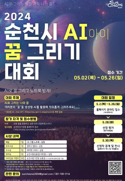 인사이드피플 노재현 기자 | 순천시는 전국 초등학생을 대상으로 5월 2일부터 26일까지'2024 순천시 AI(아이) 꿈 그리기 대회'를 연다고 밝혔다.
