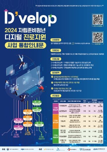 인사이드피플 조은설 기자 | 과학기술정보통신부는 자립준비청년이 디지털 분야에서 진로를 설계하고 직업적 성취를 얻을 수 있도록 올해 신규로 추진하는 2024년'자립준비청년 디지털 진로지원'사업 ‘디벨롭(D’velop)’을 6월 3일 통합공고한다고 밝혔다.